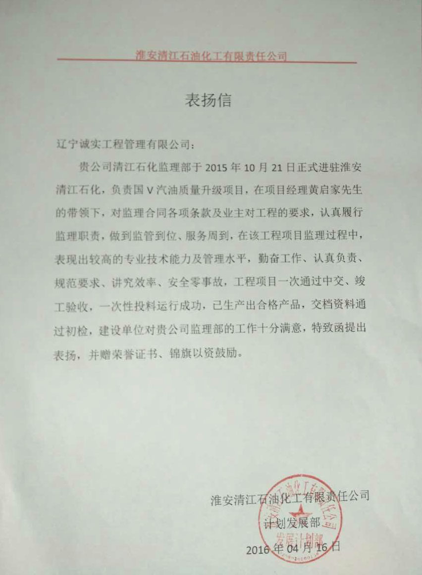 我公司监理人员在“中石化淮安清江石油化工有限责任公司国Ⅴ汽油质量升级项目”工程监理服务工作中,得到了建设单位的一致认可和肯定,对我们的工作表示十分满意,特发函提出表扬,并赠与荣誉证书、锦旗以资鼓励。